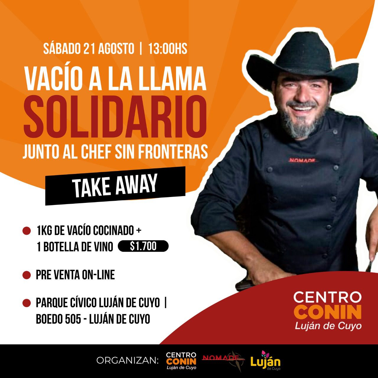 La Municipalidad, una vez más y por disposición del Intendente Sebastián Bragagnolo, se sumó a otra actividad con fines solidarios. En esta ocasión, organizó con CONIN Luján de Cuyo una encuentro gastronómico, a desarrollarse el sábado 21 de agosto en la playa de estacionamiento del Parque Cívico lujanino (Boedo 505, Carrodilla).