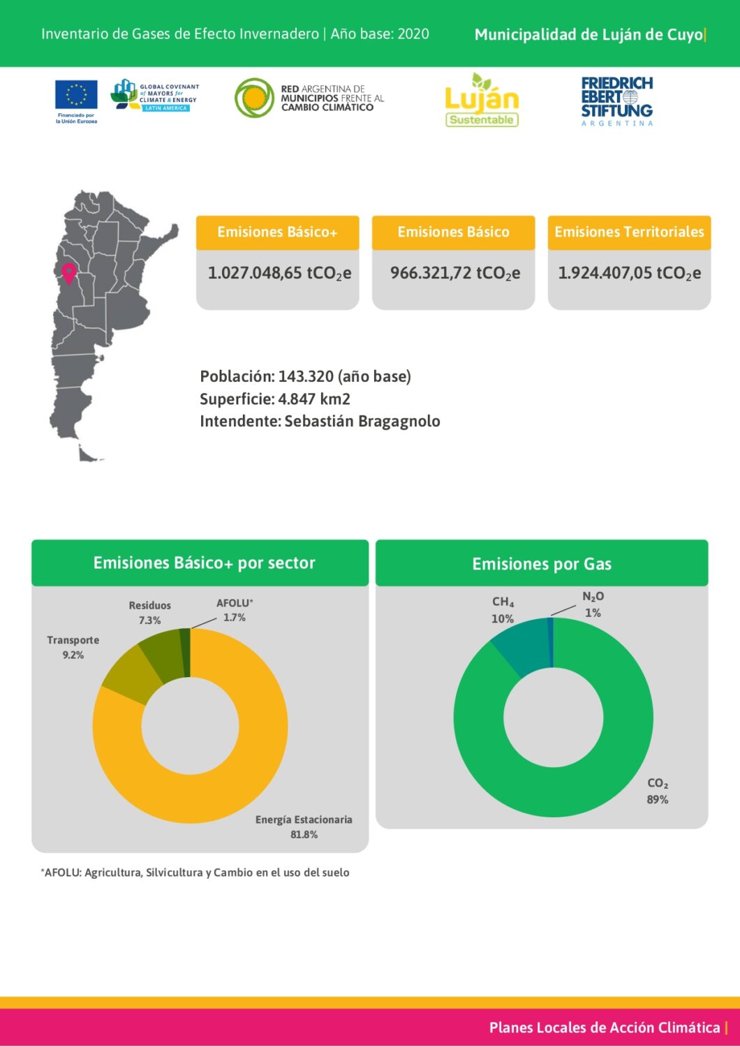 · Lanzamiento y actualización de Informe Gases Efecto Invernadero Municipal: parte de los compromisos al acceder a formar parte del Pacto Global de Alcaldes, y de las obligaciones asumidas por el Jefe Comunal Sebastián Bragagnolo, el Municipio se encuentra midiendo, todos los años, sus emisiones de gases de efecto invernadero. Con este relevamiento se intenta trabajar en función de mitigar las consecuencias negativas, mediante políticas públicas efectivas. El último resultado arrojó que el departamento disminuyó en 500 millones de tn C02e las emisiones. No obstante, la intención es seguir trabajando para continuar adaptando todas las costumbres y hábitos de consumo de los lujaninos.