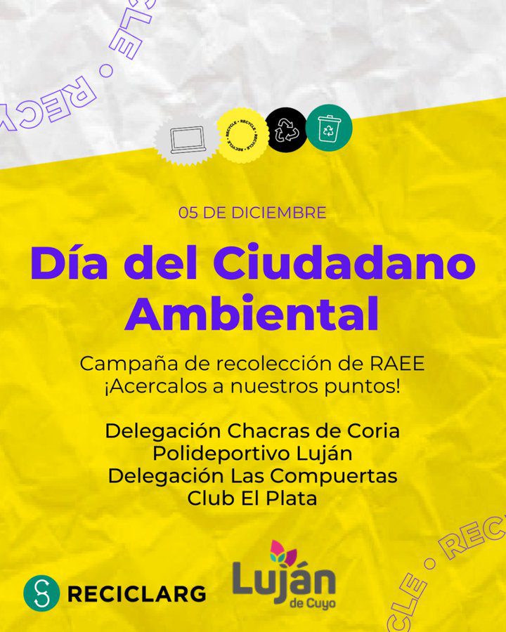 Para la próxima semana, la comuna lujanina volvió a organizar una Campaña de Recolección de RAEEs (Residuos Aparatos Eléctricos y Electrónicos). En esta ocasión, el evento no será en un único punto del departamento, sino que se montará en 4 sedes de manera paralela. Los lujaninos podrán acercar sus desechos electrónicos durante toda la jornada del lunes 5 de diciembre a las Delegaciones de Chacras de Coria y Las Compuertas y al Polideportivo Central y Club El Plata.