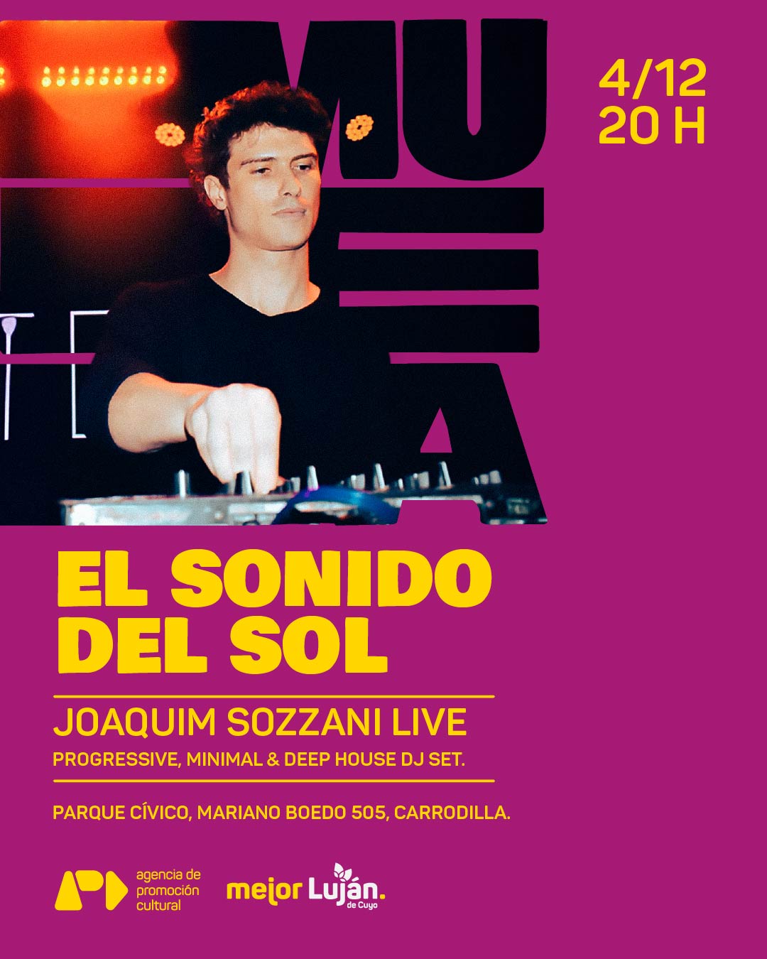 Para presentar oficialmente el Parque Solar Municipal, la Agencia de Promoción Cultural del Municipio realizará este jueves 4 de diciembre un evento abierto a toda la comunidad. Llega el “Sonido del Sol”, el primer sunset ecológico del departamento, un encuentro único en el Parque Cívico para disfrutar de un atardecer distinto, buen ambiente y música en vivo. La jornada contará con el set del DJ Joaquim Sozzani, uno de los referentes de la escena electrónica local. El dato innovador es que toda la energía del evento será generada 100% por los paneles solares, demostrando en vivo el potencial del nuevo Parque Solar Municipal.