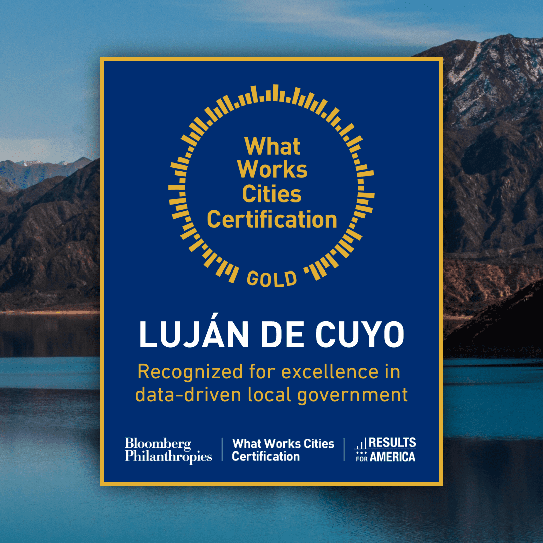 Luján de Cuyo anuncia con orgullo que Results for America le ha otorgado la Certificación What Works Cities de Bloomberg Philanthropies por el uso excepcional de datos para informar políticas públicas, asignar fondos, mejorar servicios, evaluar programas e involucrar activamente a los vecinos.