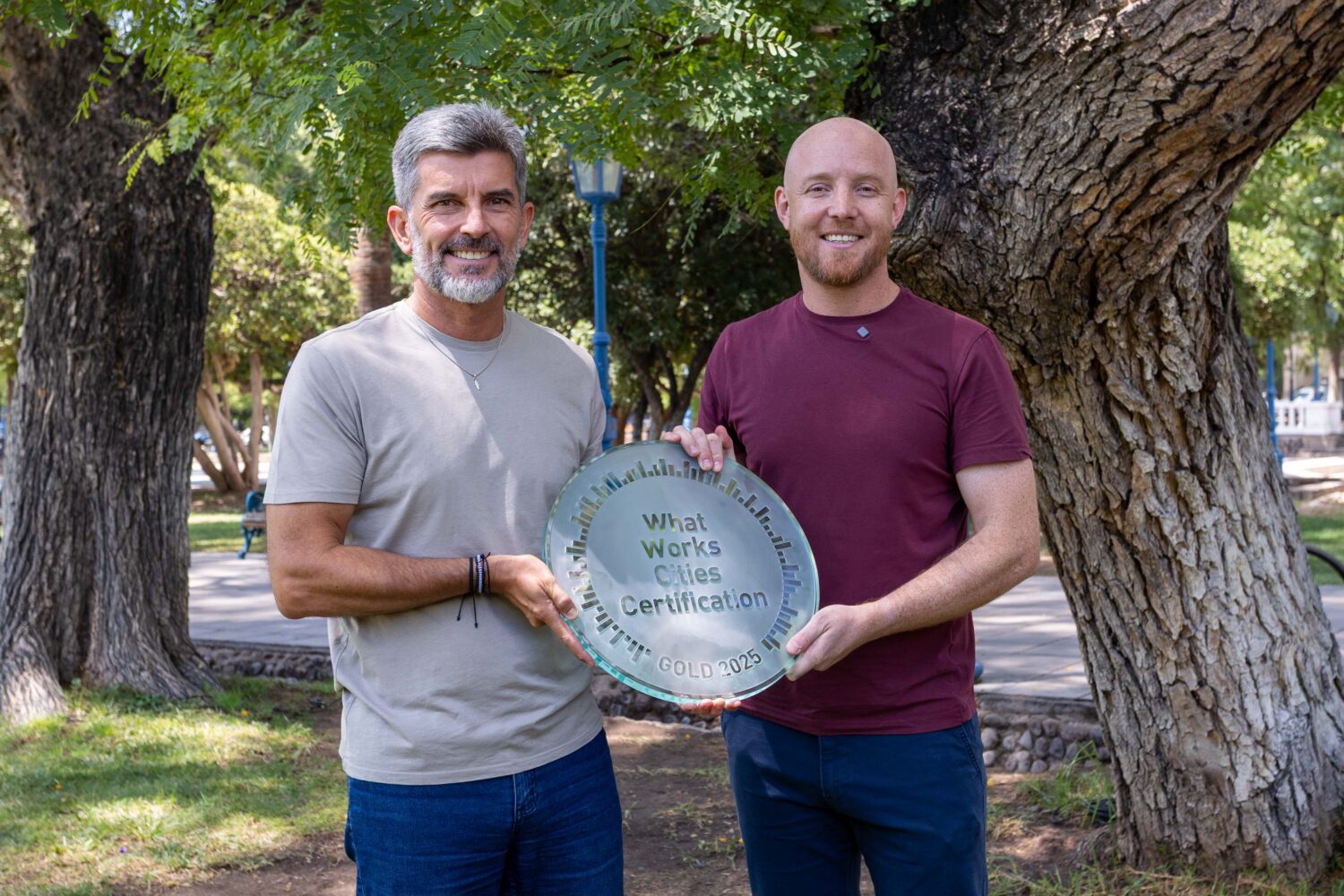 Los intendentes de Luján de Cuyo, Esteban Allasino, y de la Ciudad de Mendoza, Ulpiano Suarez, presentaron ante la prensa la obtención de la Certificación Oro What Works Cities 2025, otorgada por Bloomberg Philanthropies y Results for America.